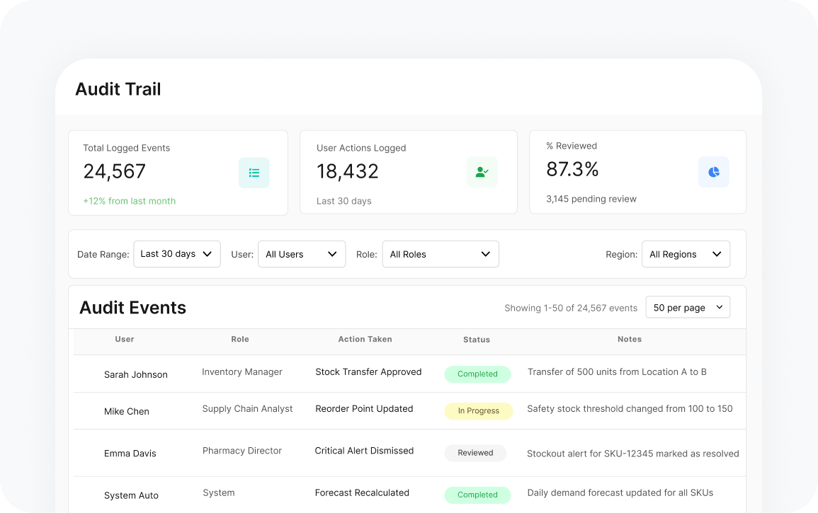 Monitor inventory, risks, and distribution nationwide from a single control tower.